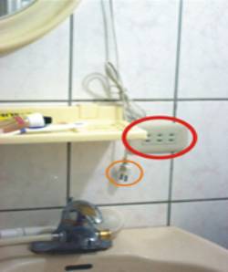 *左圖是衛浴設備的圖片,可以輕易看出,在洗手和漣篷頭處,有插座位於之間,與水源處過於接近。