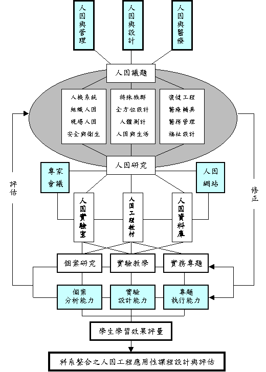如圖顯示各領域人因工程依據其專業發展相關的議題,並透過人因網站及專家會議進行交流並廣徵意見,以豐富人因實驗室、人因資料庫、人因教材的架構內容,並據以發展不同的教學方式 (個案研究、實驗教學、實務專題),以培養學生在個案分析、實驗設計,以及專題執行的能力,同時也作為評量的指標,該評量可在學習的任何階段中實施,以隨時修正教學內容與實施方式,藉以培養學生具有科系整合之人因工程實務能力。 在計畫執行過程中,三個分項計畫依其相對優勢之課程現況,以協助總計畫的順利推動,如長庚大學在資料庫及網路應用的經驗,明志技術學院工業設計系在人因設計教學累積的資源,以及工業工程與管理系在實驗室建構的支援等,將使本計畫的執行更具效率與整合意義。 本研究計畫之整體架構圖